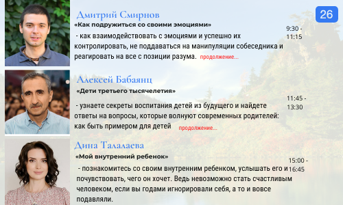 11:45 — 13:30 Алексей Бабаянц «Дети третьего тысячелетия» (Узнаете секреты воспитания детей из будущего и найдете ответы на вопросы, которые волнуют современных родителей: как быть примером для детей, в чем основы гуманного подхода и как найти путь