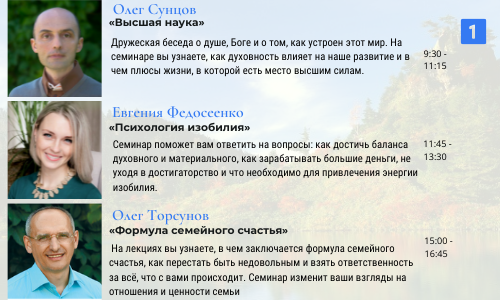 9:30 — 11:15 Олег Сунцов «Высшая наука» (Дружеская беседа о душе, Боге и о том, как устроен этот мир. На семинаре вы узнаете, как духовность влияет на наше развитие и в чем плюсы жизни, в которой есть место высшим силам.).